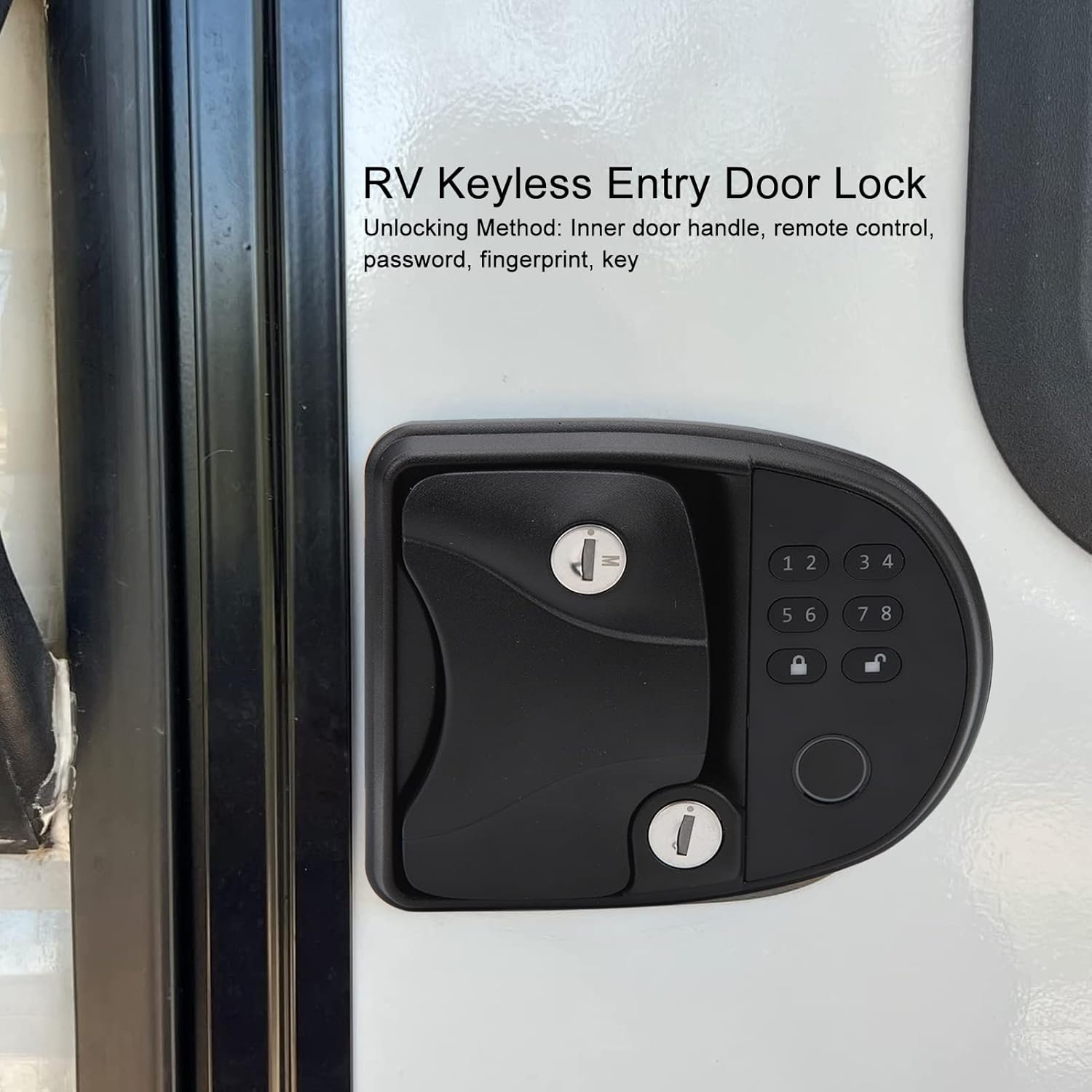 फिंगरप्रिंट आरव्ही डोर लॉकमध्ये एकात्मिक संकेतशब्द कीबोर्ड आहे) समाकलित कीपॅड 1 दशलक्षपेक्षा जास्त स्क्रोल कोड (कीलेस हँडल, फिंगरप्रिंट लॉक आणि मेकॅनिकल की समाविष्ट करण्यासाठी) निवडण्यासाठी डिझाइन केलेले आहे आणि रिमोट कंट्रोल कधीही विसरू नका) आणि रिमोट कंट्रोल